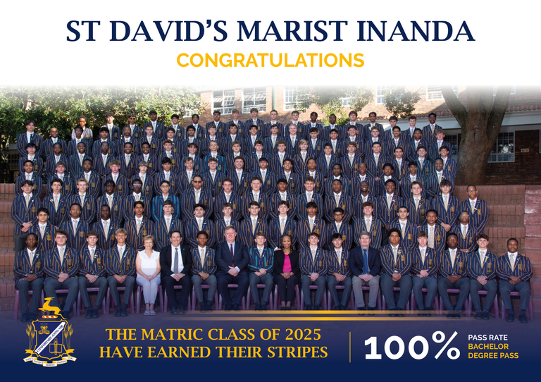 Each year the announcement of our matric results is a celebration and we are delighted to share the IEB examination results of the St David’s Marist Inanda Matric Class of 2025. Not only has this group of 127 matriculants continued a long-standing legacy of a 100% Matric Pass rate, but they have done so with the rare achievement of a 100% Bachelor Degree (BD) Pass rate. The strength of the Class of 2025 lay not only in the discipline of their individual application to their studies but also in the quiet collective support of each other to achieve as a group. This was a style evident in all aspects of their school leadership in 2025 and I ask you to join us in congratulating them on both their excellent academic achievements and a strong commitment to their school over the years.